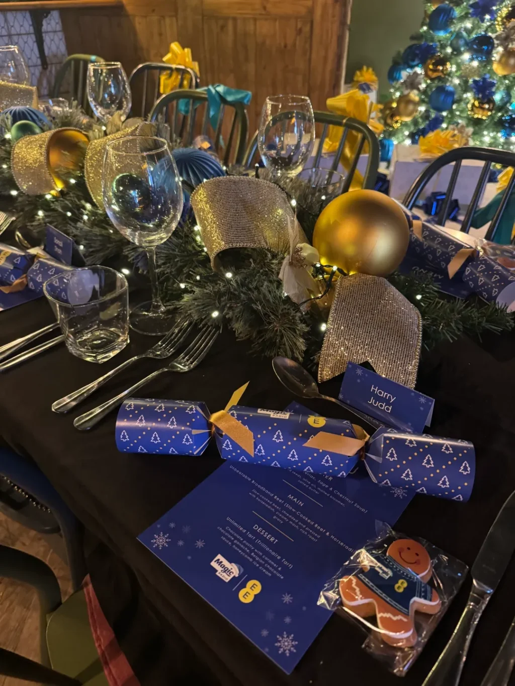 We sourced a central London venue suitable for filming, hosting, and an intimate dinner for 20 guests, transforming it into a Magic x EE winter wonderland that blended both brands’ colours into a cohesive festive setting. The evening featured a cosy three-course Christmas dinner, a surprise visit from Santa, and carol singing to enhance the atmosphere.